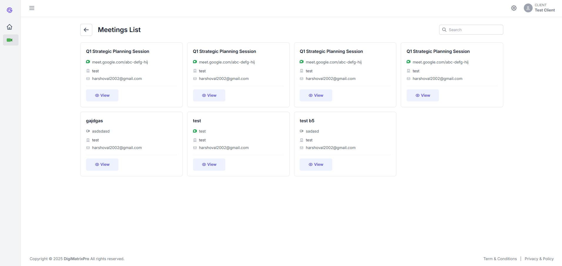 Client Meeting Management in DigimatrixPro allows businesses to organise, manage, and track all client interactions from a single platform. Whether it’s project reviews, strategy sessions, consultations, or sales calls, this feature ensures every meeting is scheduled properly, documented, and followed up efficiently.